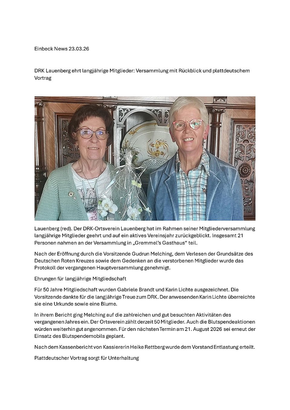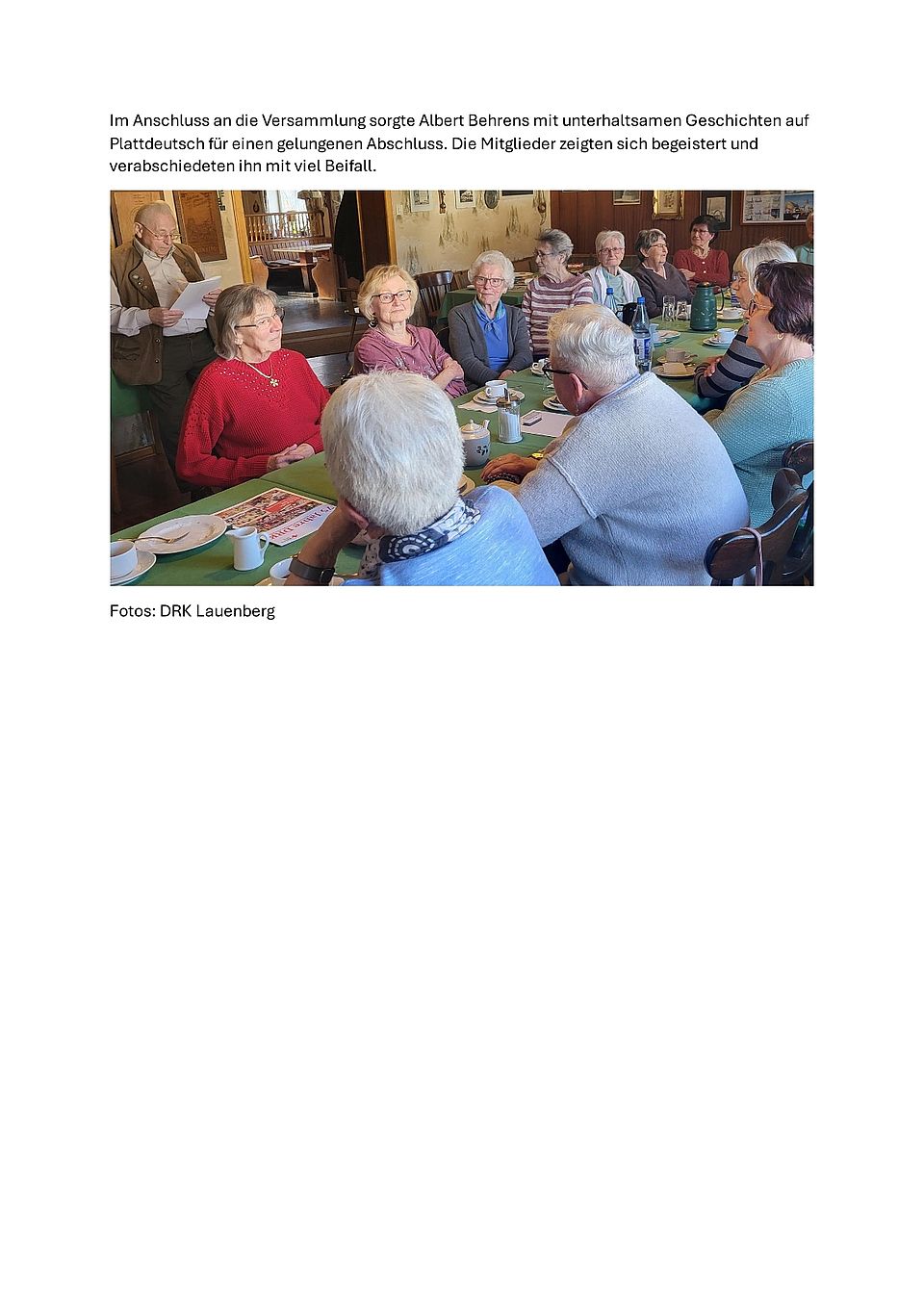 DRK Lauenberg ehrt langjährige Mitglieder: Versammlung mit Rückblick und plattdeutschem Vortrag