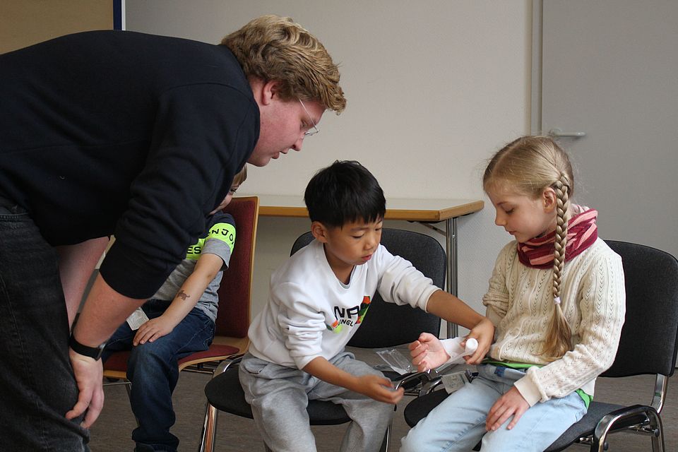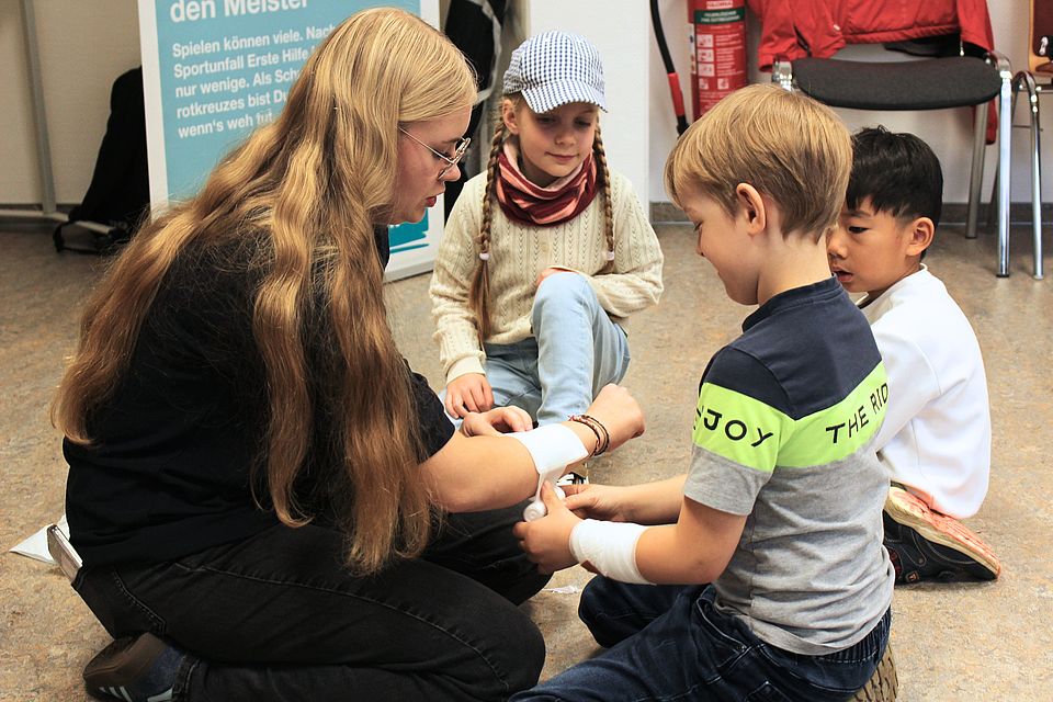 Alle waren mit Begeisterung dabei, denn sie durften vieles selbst erkunden und ausprobieren. An der ersten Station zeigten die FSJler*innen Nelly und Lars, sowie Bereitschaftsmitglied Tilla der Gruppe den Inhalt eines Erste-Hilfe-Koffers und die Kinder konnten mithilfe der drei engagierten Ehrenamtlichen selbst üben, wie man einen Verband anlegt oder ein Pflaster richtig klebt.