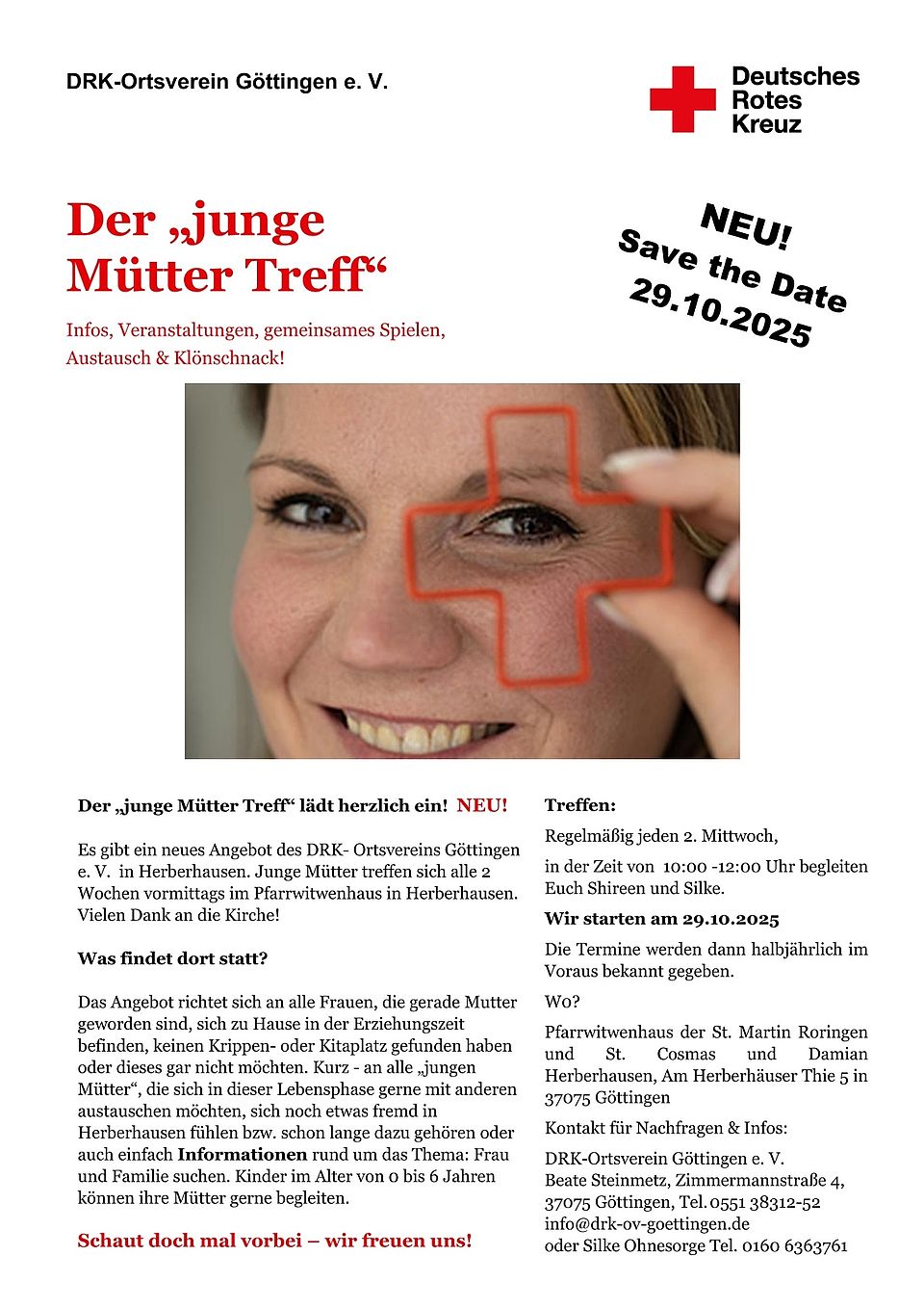 DRK-Ortsverein Göttingen e. V. Beate Steinmetz, Zimmermannstraße 4, 37075 Göttingen, Tel.0551 38312-52 info(at)drk-ov-goettingen(dot)de oder Silke Ohnesorge Tel. 0160 6363761