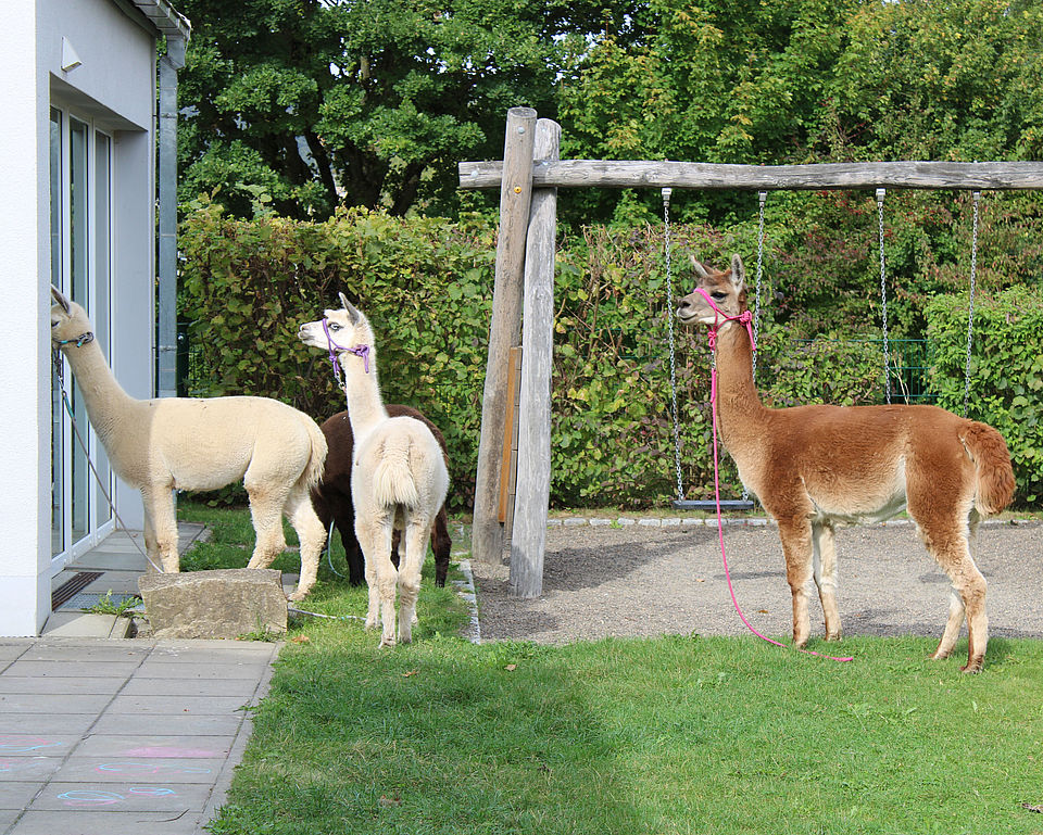 Nach einer kurzen Einweisung durften alle, die sich trauten die Alpakas streicheln, sie über den Spielplatz führen und gespannt zuhören, wie die Alpakas untereinander kommunizieren.